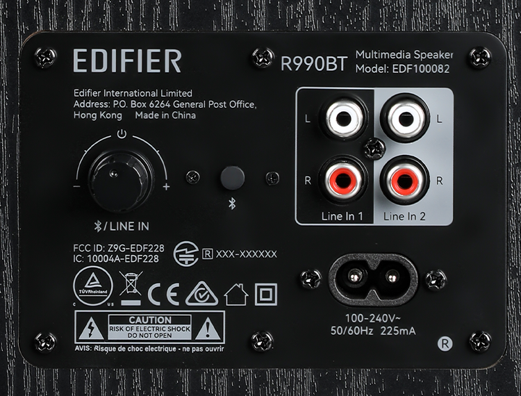 The R990BT speaker is designed with a rear-mounted control knob and button, enabling users to control the speaker's functions easily and accurately.