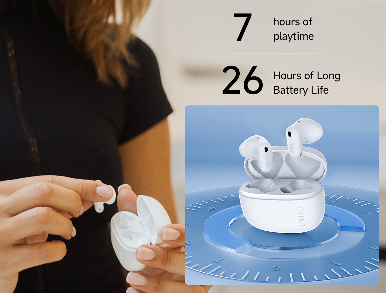 Enjoy 7 hours of playtime on a single charge, plus 19 hours with the charging case for a total of 26 hours, allowing for all-day music enjoyment. Supports fast charging - 15 minutes of charging provides 1.5 hours of playback time.
