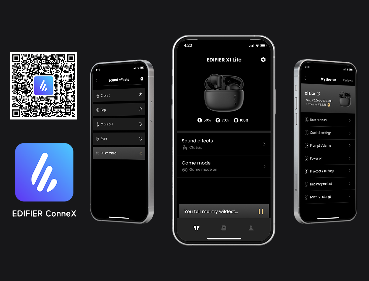 Download the EDIFIER ConneX App to explore various music styles, personalize control settings, update firmware, rename your earbuds, and locate lost earbuds.