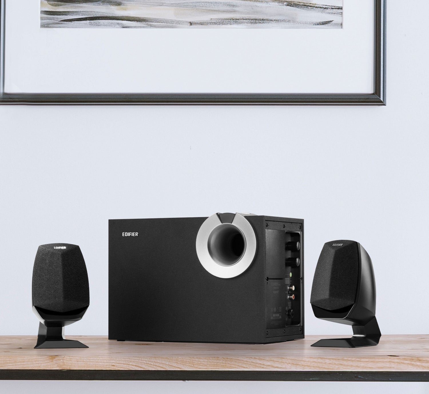 El sistema incluye dos altavoces satélite de 84×153×103 mm (3,3 pulgadas x 6 pulgadas x 4 pulgadas) y un subwoofer de 5" de 161×200×280 mm (6,3 pulgadas x 7,87 pulgadas x 11 pulgadas) con una potencia de salida máxima de 68 vatios para crear una experiencia de audio de sonido amplia y completa.