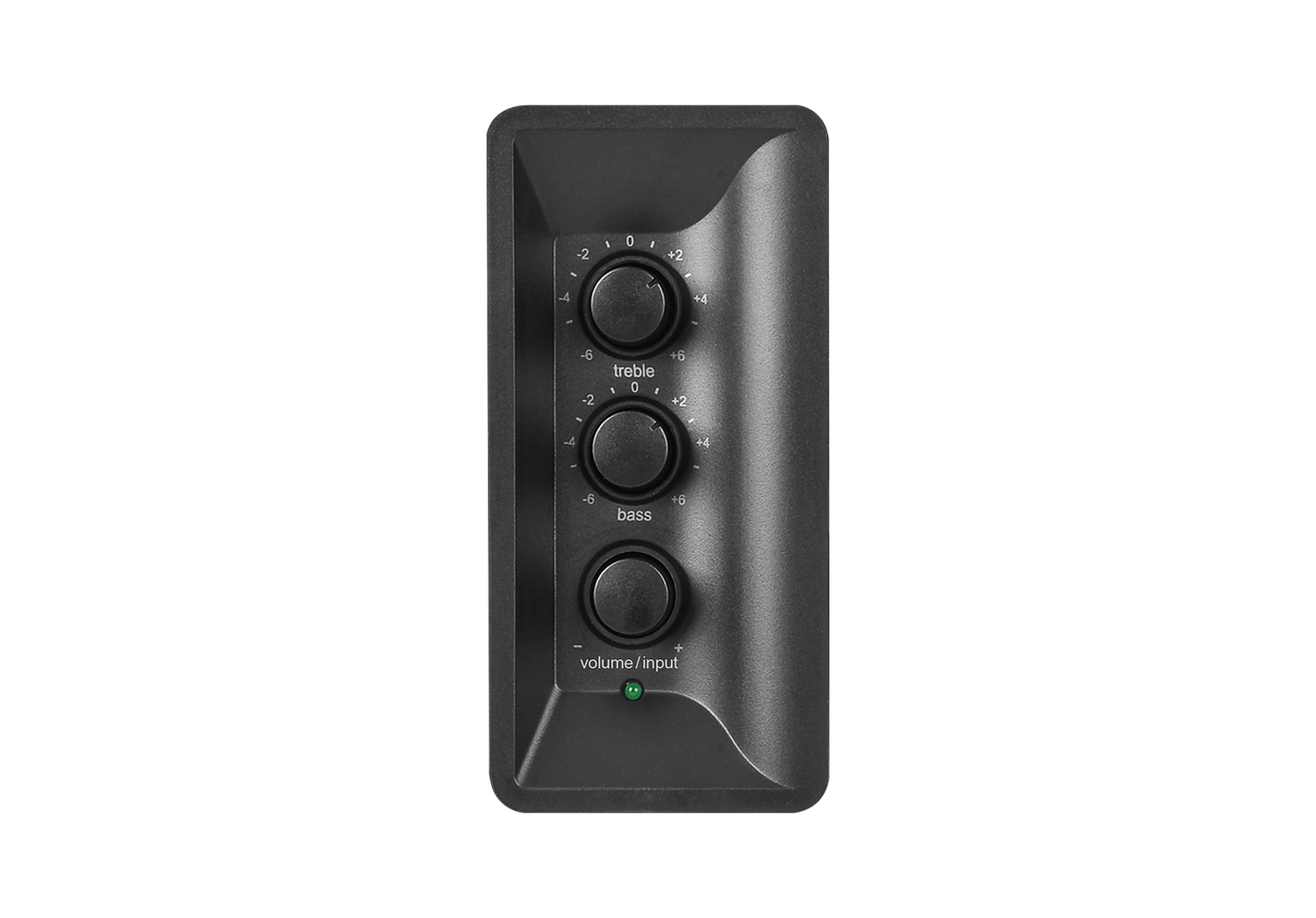 Los convenientes diales en el panel lateral del altavoz le permiten ajustar los graves, los agudos y el volumen para adaptarse a las preferencias individuales; presione el dial de volumen para alternar entre las entradas.