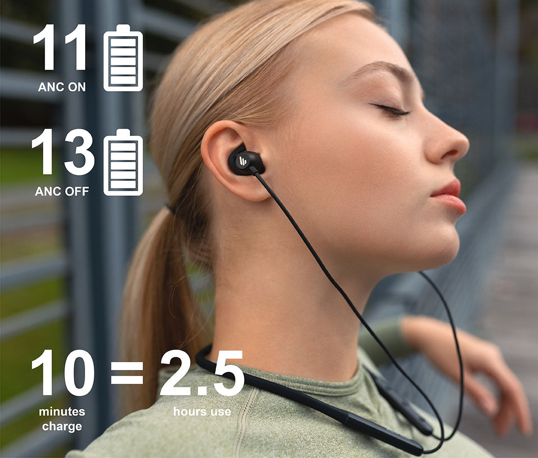 Los auriculares W280NB son compatibles con la tecnología de carga rápida. Tras 10 minutos de carga, ofrecen una autonomía de 2,5 horas. Disfruta de hasta 13 horas de reproducción con la cancelación activa de ruido (ANC) desactivada y 11 horas con la ANC activada.
