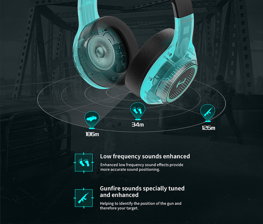 Combinando una unidad de NdFeB de 40 mm con un diafragma de polímero PET, los auriculares producen tres bandas de frecuencia nítidas, un excelente campo sonoro y graves potentes, creando una experiencia de juego inmersiva. Sonidos de baja frecuencia mejorados. Los efectos de sonido de baja frecuencia mejorados proporcionan un posicionamiento del sonido más preciso. Sonidos de disparos especialmente optimizados que ayudan a identificar la posición del arma y, por lo tanto, al objetivo.