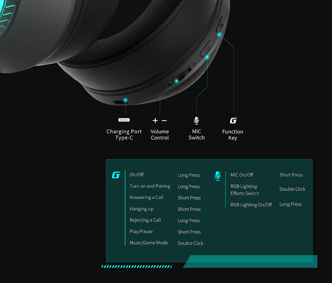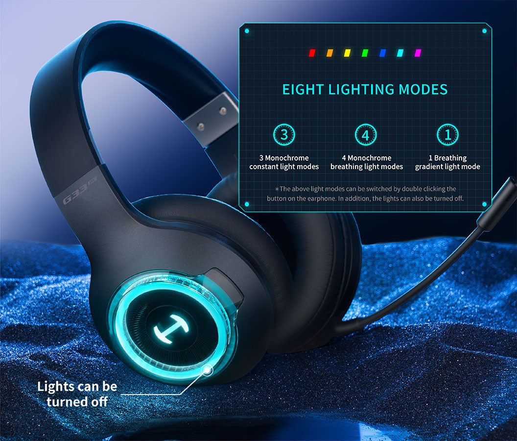 8 modos de iluminación RGB ajustables con un solo botón, lo que permite al jugador personalizar su configuración de juego. Ocho modos de iluminación: 3 modos de luz monocromática constante; 4 modos de luz monocromática con respiración; 1 modo de luz con gradiente de respiración. * Los modos de iluminación mencionados se pueden cambiar haciendo doble clic en el botón del auricular. Además, las luces también se pueden apagar.