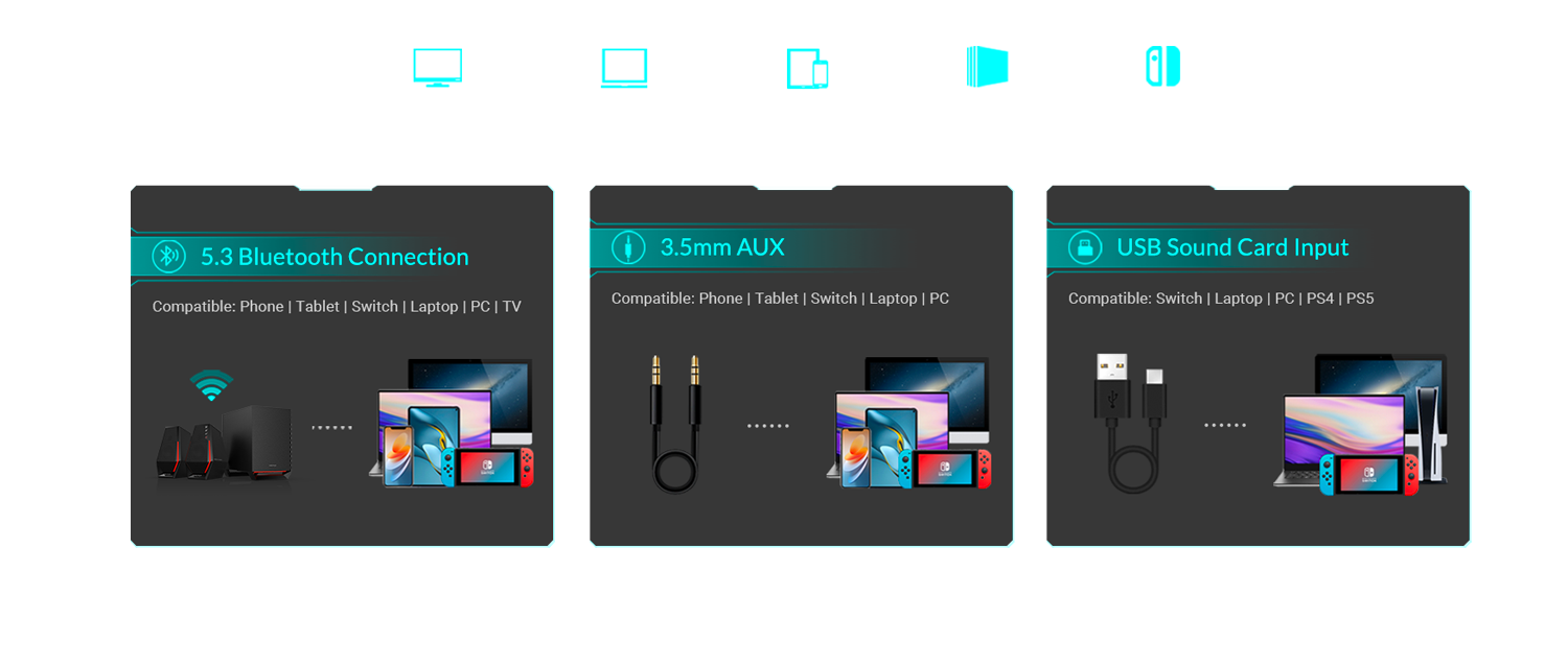 El G1500 MAX cuenta con una conexión inalámbrica fiable mediante Bluetooth 5.3. Este sistema de altavoces también admite una tarjeta de sonido USB y una entrada AUX, lo que garantiza la compatibilidad con diversos dispositivos. Cambie fácilmente entre interfaces mediante el cable USB-C a USB-A.