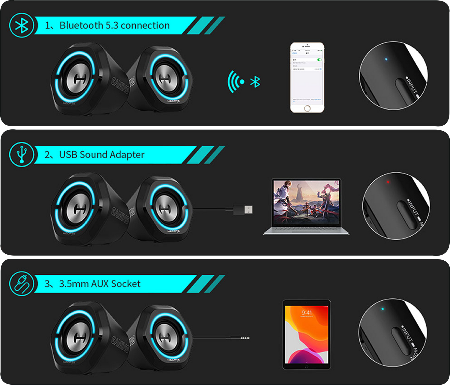 The gaming speakers have simple wired controls to provide a user-friendly experience by controlling the volume, lights effect, gaming or music mode, and the three input modes, like USB sound adapter input, 3.5mm AUX input, and Bluetooth 5.0 input. With different colour indicators, you can know what the mode is.