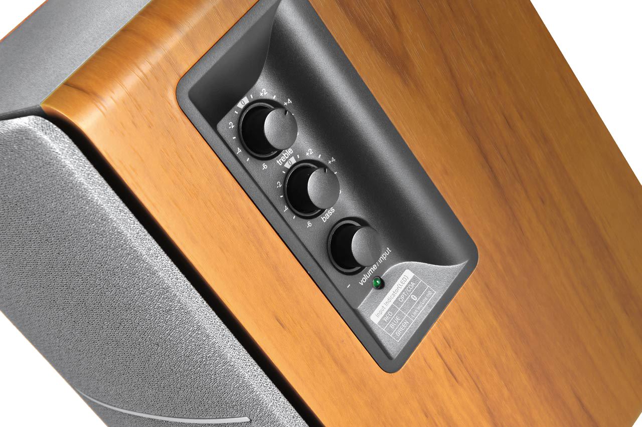 Adjust the EQ using the on-board controls located on the active/powered Bluetooth speaker. Treble, bass, and volume knobs located on the side panel. The clear accessibility to on-board controls and modern functionality heighten the amiability of the R1280BD powered Bluetooth speakers. Clear and concise controls compliment the manual providing uninterrupted playtime.