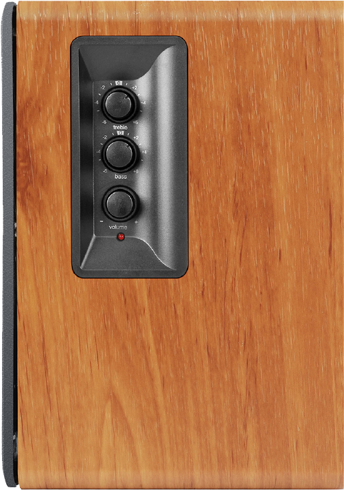 Convenient dials on the side panel of the speaker allows you to adjust the bass, treble, and volume.