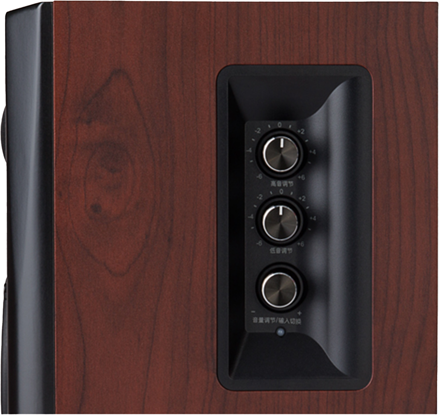Take full control of your audio with the side panel controls on the side of one of the bookshelf speakers. Three knobs are located on the side that effect the bass, treble and volume for the entire 2.1 system. Once switched on, the power light will appear on so you know your system is working.