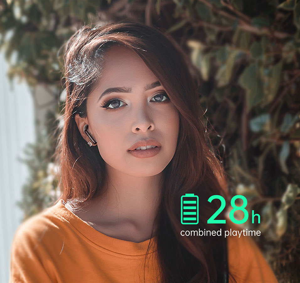 7h Playtime per charge, up to 28h with charging case. Convenient for all day use with uninterrupted music.